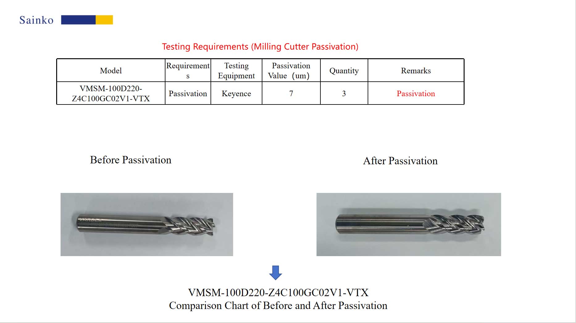 The test sample for this test is a milling cutter provided by the customer, model VMS M-100D220-Z4C100GC02V1-VTX, with a total of 3 pieces. The core requirement is to passivate the milling cutter, and the passivation value must meet the standard of 7 μ m. To accurately meet the requirements, our company uses PL-24AX passivation equipment and 15000-L type abrasive for processing. Through precise control of passivation speed, pressure and other parameters by the equipment, combined with the fine grinding effect of the abrasive, the passivation values of the three milling cutters have consistently reached the preset requirement of 7 μ m, while eliminating the original saw teeth and burrs on the cutting edge. After subsequent verification, the passivated milling cutter not only significantly improves the surface quality of the processed product during cutting, but also optimizes the chip discharge effect, effectively reducing the problems of chip accumulation and scratching the workpiece. The specific test results are detailed in this report.