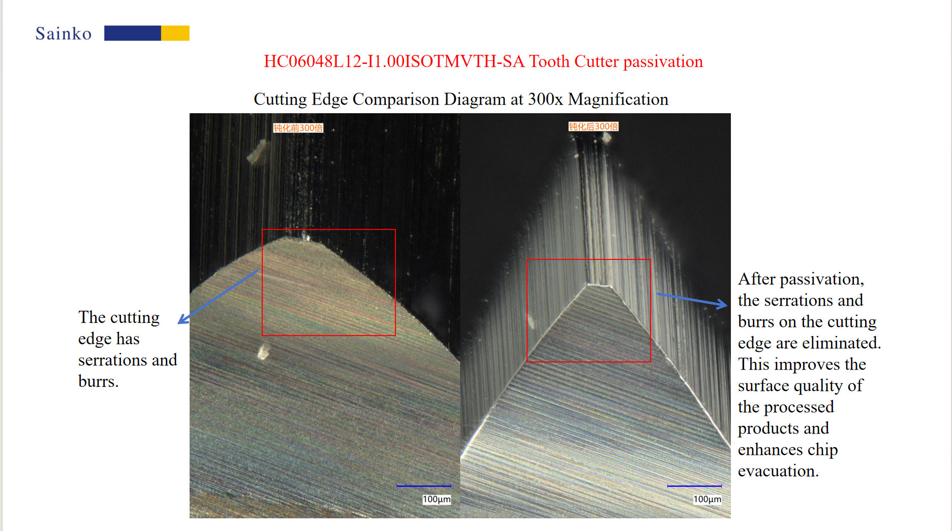 By comparative observation, it can be seen that there are obvious small serrations and burrs on the cutting edge before passivation, and the cutting edge is irregular, which can easily cause problems such as high cutting resistance and poor surface roughness; After passivation, the blade is flat and smooth, with a uniform and rounded shape, and no residual burrs. This improvement effectively enhances the surface quality of processed products, optimizes the chip discharge effect, and significantly reduces the risk of chip accumulation and workpiece scratches.